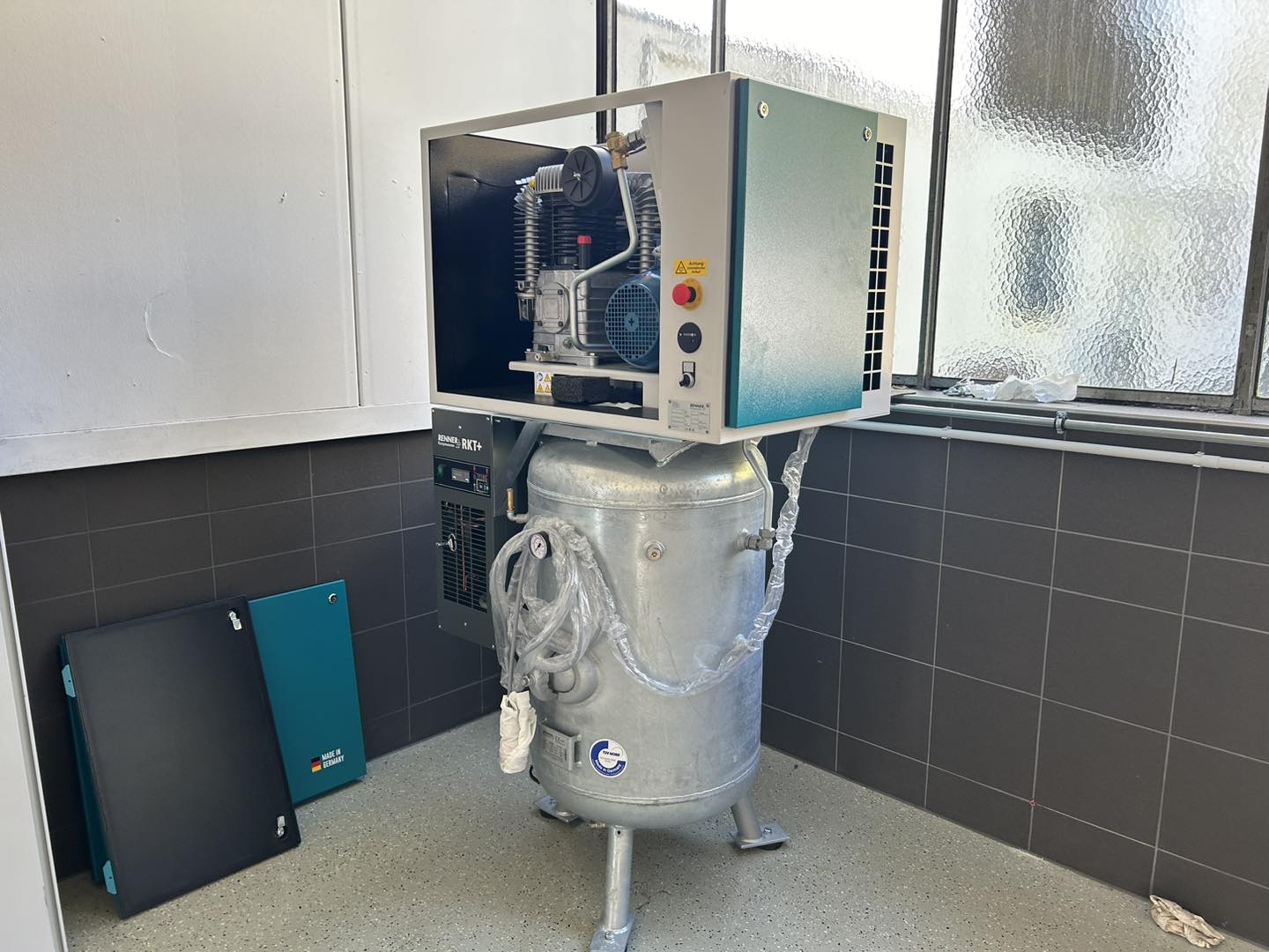 Durch eine Fachfirma wurde nun eine Druckluftanlage installiert, somit können die Einsatzfahrzeuge in der Fahrzeughalle mit Druckluft versorgt werden.