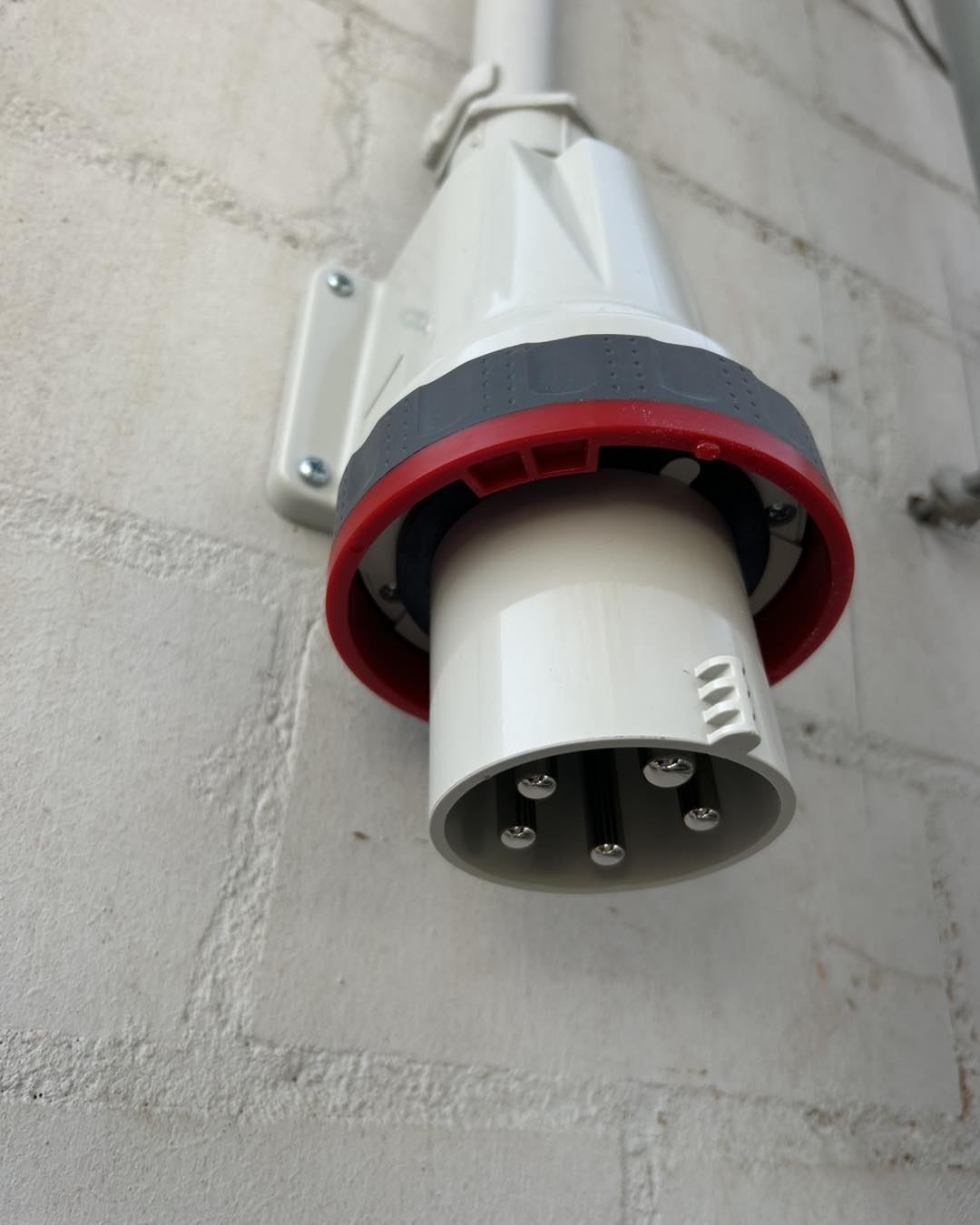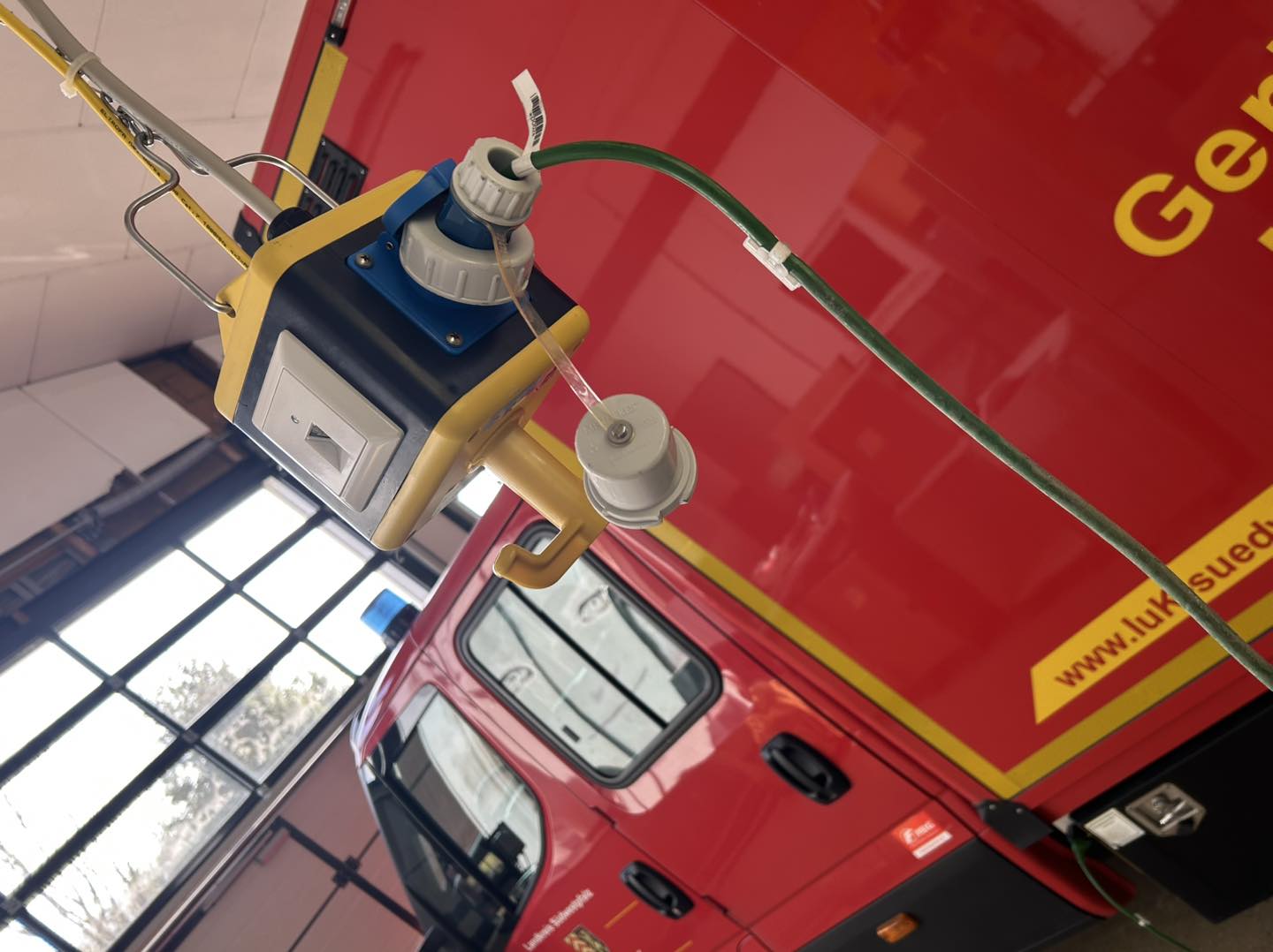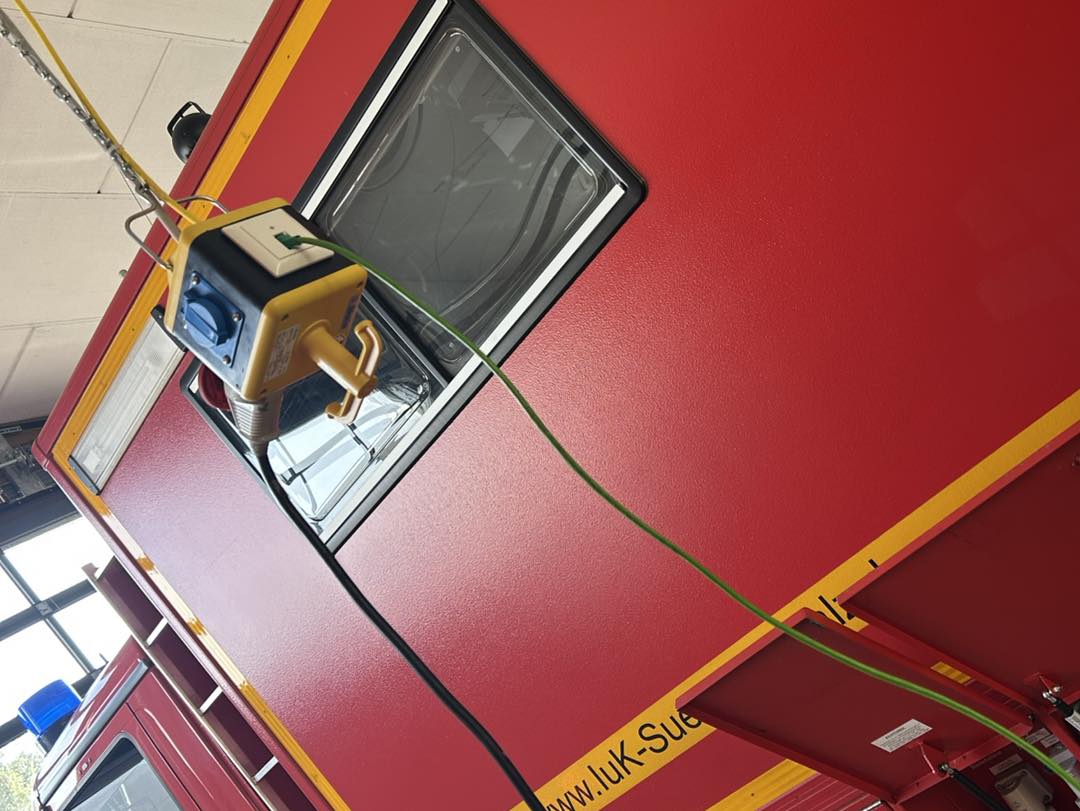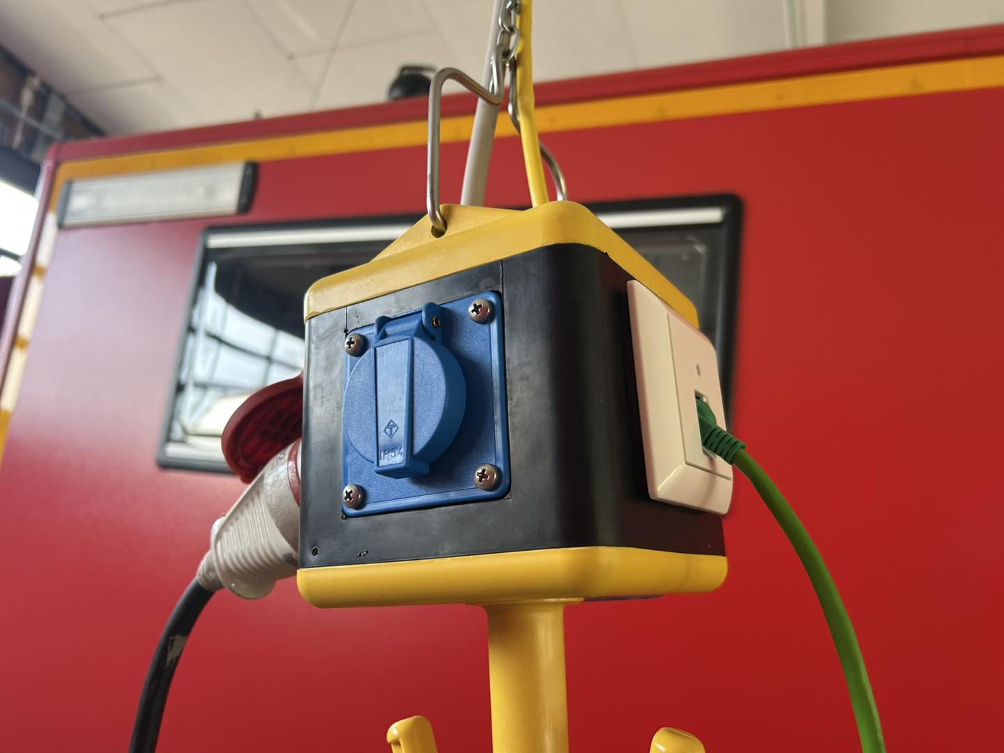 An den Stellplätzen für die Einsatzfahrzeuge wurden Versorgungseinheiten montiert. Jeder Würfel ist mit zwei Steckdosen 230V, einer Steckdose 400V und einer Netzwerkdose ausgestattet.