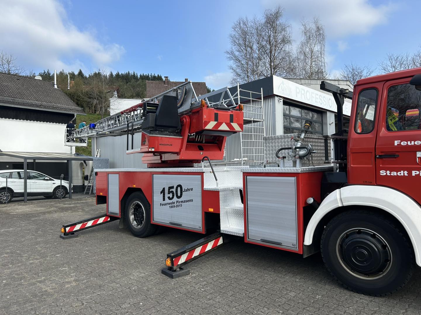 Auch möchten wir uns bei der Feuerwehr Pirmasens bedanken die uns mit ihrer Drehleiter kurz ausgeholfen haben. Durch den Einsatz der Drehleiter konnten wir ein kleines Stück sehr schnell und sicher streichen, an dass wir sonst nur sehr schwer dran gekommen wären.